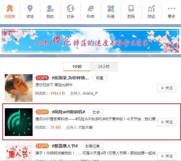 今年愚人节,腾讯用一个“风险WiFi粉碎机”的概念,就引起了全网大讨论。当天,“风险WiFi粉碎机”的话题就冲上了微博话题榜第二位。