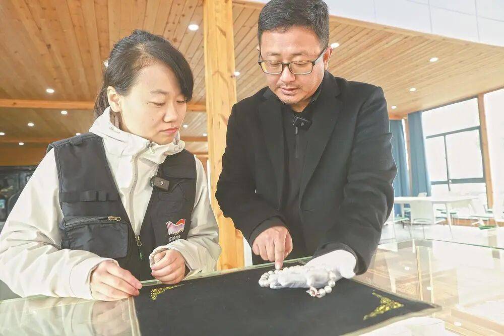 浙江清湖控股集团有限公司副总经理詹律(右)向记者讲解珍珠知识。王列刚 摄